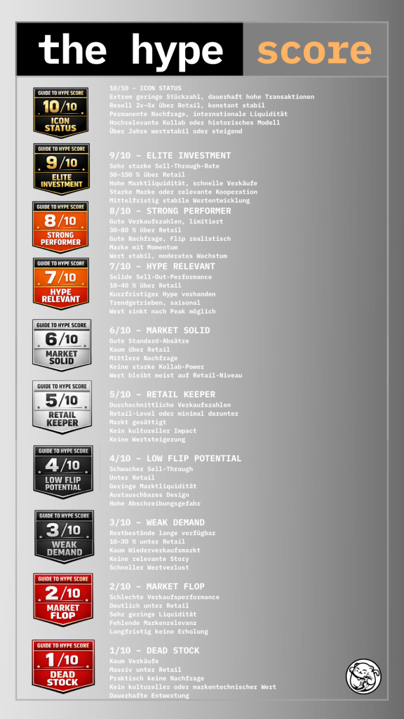 Skala 1–10 (Scale 1–10): 10 = Bestnote (Best in Class). Bewertet nach Marktdaten: Verkäufe, Resell, Nachfrage, Cultural Impact, Wertstabilität.